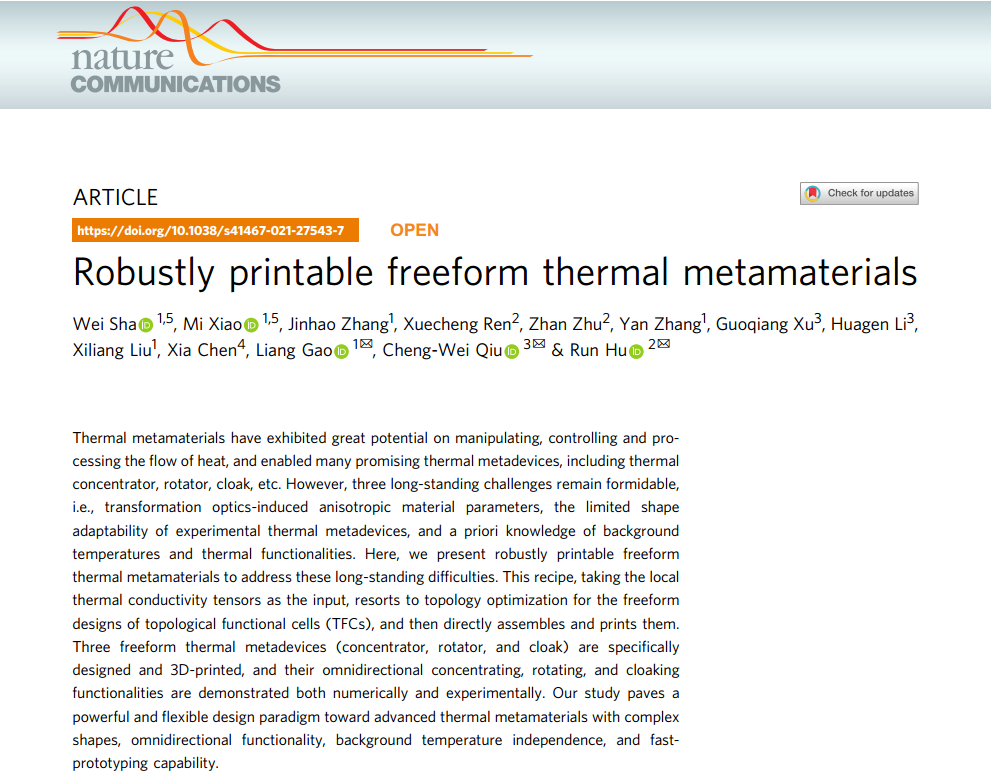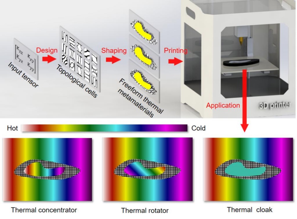 12月10日,《自然·通讯》(Nature Communications)在线刊发了机械学院高亮教授团队与新加坡国立大学仇成伟教授、能源学院胡润副教授关于热超构材料拓扑优化设计的最新研究成果“Robustlyprintable freeform thermal metamaterials(稳健可打印的自由形状热超构材料)”。机械学院博士生沙伟、副教授肖蜜为论文共同第一作者,高亮教授、仇成伟教授、胡润副教授为论文共同通讯作者,华中科技大学数字制造装备与技术国家重点实验室为论文第一完成单位。 超构材料因具有常规自然材料不具备的属性被学术界和工业界广泛关注,如力、热、声、电磁超构材料等,其中热超构材料因可操控热流获得一系列超常热学功能(如:热隐身、热集中、热伪装、热旋转等)备受关注。随着变换光学和散射抵消方法应用于热学领域,一系列具有不同功能的热超构材料纷纷被设计和制备,但是,目前热超构材料设计仍面临三大挑战:(1)利用变换热学法设计的热超构材料需采用非均匀、各向异性的材料参数,而常规材料往往不具备,使得实验制备热超构材料难度很大;(2)热超构材料结构形状受限,目前以圆形、椭圆形等规则形状的热超构材料制备居多,影响了热超构材料的工程适用性;(3)采用数值优化方法设计热超构材料依赖背景温度场和目标超常热学属性,影响了设计的灵活性和热超构材料的全方位功能性。因此,如何设计并制备具有自由形状且全方位功能性的热超构器件是热超材料领域亟需解决的难题。 图1 稳健可打印的自由形状热超构材料拓扑优化设计 针对以上难题,研究团队提出了一种稳健可打印的自由形状热超构材料拓扑优化设计方法(图1),采用拓扑优化设计具有指定导热系数的拓扑功能单胞,组装生成热超构材料,开展了自由形状热超构材料拓扑优化设计-热超构器件增材制造-热学仿真与实验性能测试。研究团队按照上述思路,设计了具有自由形状的热集中、热旋转和热隐身等三类热超构材料构型,并开展了数值仿真(图2)和热学实验(图3)性能测试,结果表明无论热流从何种方向通过三种热超构材料,其内部各自呈现出良好的热集中、热旋转和热隐身效果。 图2 拓扑优化设计的三种热超构材料及其数值仿真温度场分布(左:热集中;中:热旋转;右:热隐身) 图3 3D打印制备的热超构器件及其热学实验温度场分布 研究团队采用拓扑优化方法设计了具有自由形状、全方位功能性的热集中、热旋转和热隐身超构材料,达到了当前利用混合材料结构实现热超构材料设计的最好水平,将有力推动热超构材料在航空航天、电子等领域的工程应用。研究工作得到了国家自然科学基金(52076087)、国家重点研发计划(2020YFB1708300)等项目资助。(原文链接:https://mp.weixin.qq.com/s?__biz=MzU1OTI0NjU0Mw==&mid=2247484318&idx=2&sn=29300743467c0a4f98e40c28e609e3ed&chksm=fc1b7e3ecb6cf72807021182ce55d71e1e8531abb50c660a871555a2332b315eb8d9bb3254c6&scene=27)