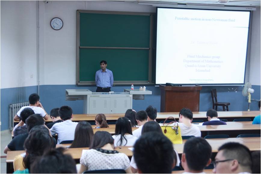 9月5日上午, Hayat教授在北校区阶梯教室J-508为我校师生做了题为“Peristaltic Motion of a Magnetohydrodynamic Generalized Second-Order Fluid in an Asymmetric Channel”的精彩报告,米兰milan官方网站150余名师生参加了报告会。