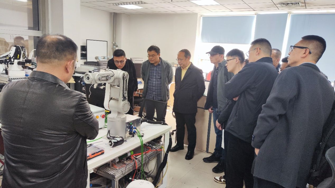 3月28日下午座谈之前,王慷参观了我院机器人智能制造实验室,听取了实验室在数字孪生工业机器人和具身智能机器人柔顺装配方面的工作介绍。