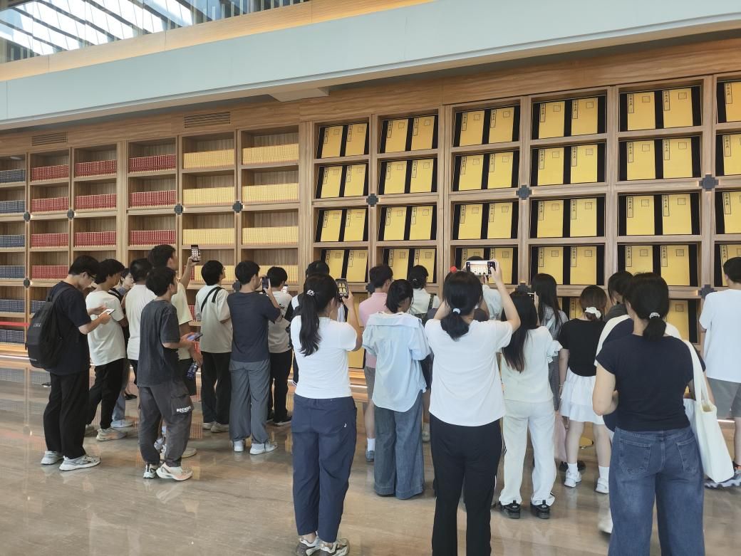 步入馆内,跟随讲解员的脚步,同学们详细了解了中国国家版本馆“一总三分”的总体布局以及西安分馆的规划理念、建设背景、建筑特点、馆藏典籍等情况。