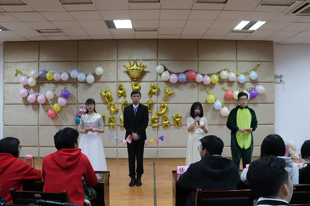团委的同学们纷纷入座以后,下午6时30分整,主持人用慷慨激昂的语气宣布:元旦晚会正式开始。来自实践部的同学们为大家献上了一支印度舞蹈,在带给大家视觉享受的同时也让大家体会到了异国风情;蒲公英的同学们更是别出心裁,将传统的荆轲刺秦王赋予了现代元素,在紧追时代脚步的同时又不忘记历史带给人们的思考;素拓部的古筝表演和外联部的手风琴表演一古一今,大家静下心去聆听,晚会的节目形式变得更加丰富多彩。晚会不仅仅有精彩的表演,每三个节目之间还插有游戏环节,“踩气球”“占领阵地”“小精灵”三个游戏让观众也参与其中,从坐在台下看节目变成了上台为大家表演节目,看演结合,一瞬间活动室成为了欢乐的海洋。晚上10点整,副书记任权宣读了表彰决定,对 2018 年成绩显著、表现突出的部门和个人进行了表彰并为团委的同学们送上了新年祝福。