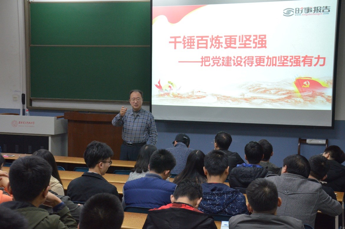 梁书记先是高屋建瓴地分析了共产党取得辉煌胜利的历史原因和现实制度,全面从严治党、政治建设突出、反腐败斗争取得压倒性态势,也尖锐指出了党所面临的挑战和困难,如执政考验、能力不足、外部环境等考验,并结合学校现实一一例举。为此梁书记提出“千锤百炼更坚强,把党建设得更加坚强有力”。