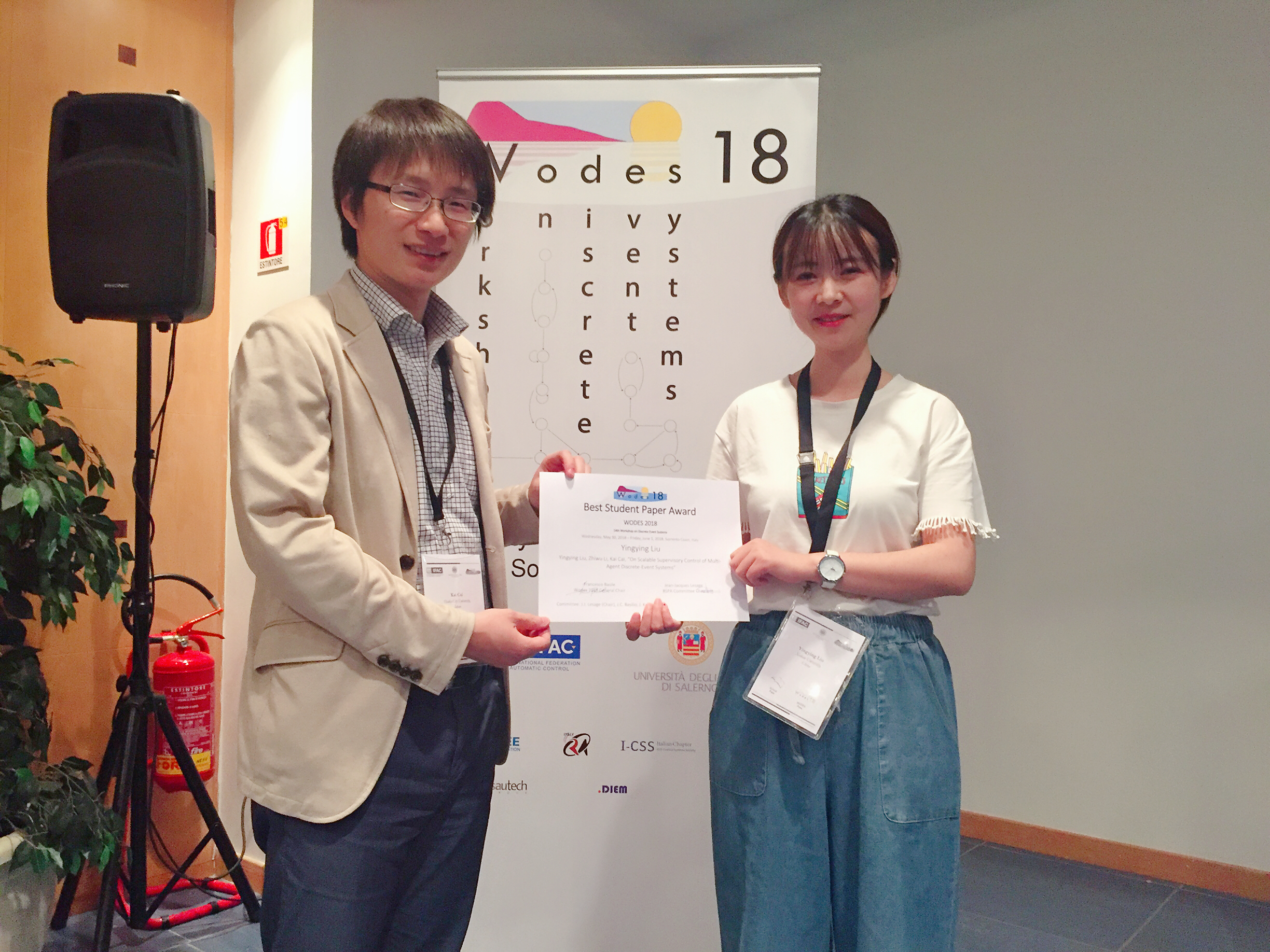 (通讯员 马子玥)5月30日至6月1日,第十四届“离散事件系统国际研讨会” (Workshop on Discrete Event Systems,WODES)在意大利索伦托举行。来自30多个国家的100余名研究人员、青年学者及学生参加了会议。我院2015级博士生刘颖莹同学的论文“On Scalable Supervisory Control of Multi-Agent Discrete-Event Systems”获得“最佳学生论文奖”(Best Student Paper Award)。
