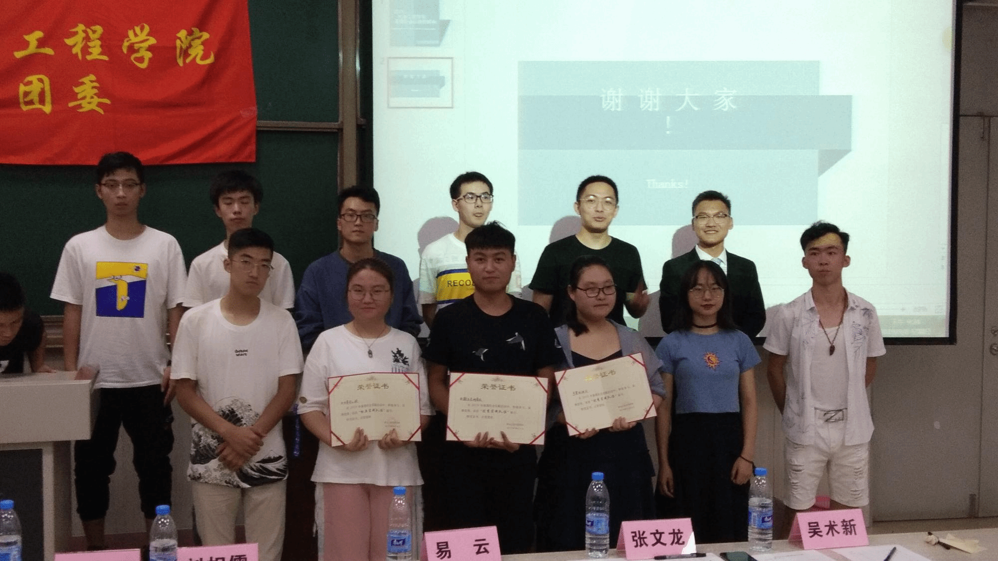 最后的颁奖环节,三位团委副书记为获奖队伍颁发证书。颁奖结束后所有参赛人员、评委以及工作人员合影留念。