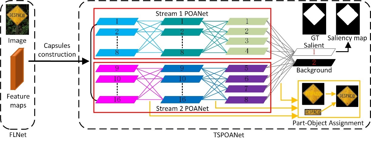 胶囊网络(Capsule Network, CapsNet)是近几年由“深度学习之父”Geoffrey Hinton提出的新型深度学习网络,其通过路由匹配将低级胶囊(表示“部分”)与高级胶囊(表示“整体”)匹配,从而解析图像中的部分-整体关系。基于此,团队首次将胶囊网络应用于显著目标检测,用于获取显著目标检测的完整性和一致性,并在此基础上,提出了一种深度二分流显著目标检测网络结构,采用一种局部路由模式,将低级胶囊只与一组高级胶囊而非所有的高级胶囊匹配。该局部路由模式不仅大大降低了胶囊网络的参数量和计算复杂度,还从一定程度上缓解了胶囊网络中由于冗余匹配带来的误匹配的问题,进一步提高了网络训练效率和检测精度。