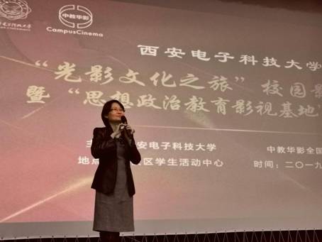 中教华影全国校园电影院线总经理熊殷致辞。她在致辞中介绍了中教华影公司坚持立德树人、传承文明、以文化人、价值引领的理念宗旨,希望通过推动主旋律电影进校园,让电影成为大学生思想政治教育新的教学资源,帮助在校学生提高思想水平、政治觉悟、道德品质和审美情趣。