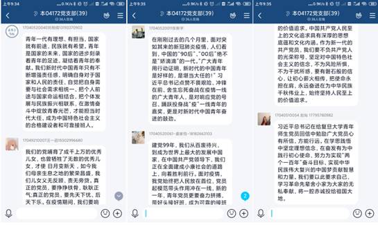 本04172党支部已返校的党员在海棠五号楼班部集体进行了观看学习,未返校的同学在家中进行个人观看学习。支部预备党员易云同志说,习近平总书记在给复旦大学《共产党宣言》展示馆党员志愿服务队全体队员的回信中勉励他们继续讲好关于理想信念的故事,并对全国广大党员特别是青年党员提出殷切期望。作为立志成为一名合格党员的大学生,我们都应响应总书记的号召,从生活点滴做起,培养艰苦奋斗的意志品质,以知识武装自己,无愧于祖国的培养,无愧于总书记的期望。