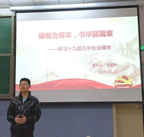 (通讯员 张建伟 周蕾)2020年12月21日19时,米兰milan官方网站于北校区阶梯教室305进行了十九届五中全会精神宣讲活动,并取得圆满成功。此次宣讲会的宣讲人为研究生支部书记张建伟,主题为“做有为青年,书华丽篇章”。米兰milan官方网站全体党员、发展对象以及积极分子参加了此次学习活动,并于会后积极发表感言和收获。