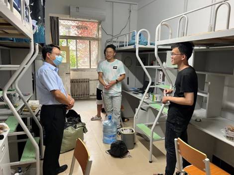 除了迎新外场,党委副书记陈武和机电院导员周蕾还一同前去新生宿舍,向新生们传达欢迎与祝福。陈书记亲切地同新生们聊了每个人所来自的省份,对西安的认识。并询问对学校的饭菜等条件是否满意。最后向同学们了解了导师的情况,叮嘱大家要保持良好的精气神,认真学习,认真科研,同时也要注意疫情下要做好防护工作,并给新生们分发了学院的定制口罩。