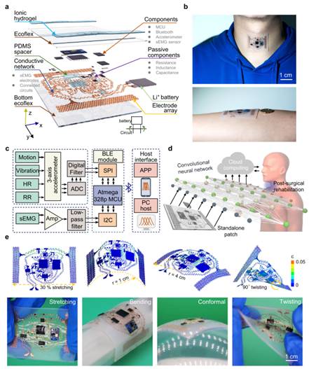 针对上述问题,近日,米兰milan官方网站王卫东教授、厦门大学高立波副教授、香港大学陆洋教授以及宾州州立大学程寰宇教授联合唐都医院耳鼻喉科主任赵大庆教授和空军军医大学张杨教授等多位合作者,报道了一种用于喉部康复监测的具有传感器内自适应机器学习能力的全集成独立可延展的器件平台。成果以“A fully integrated, standalone stretchable device platform with in-sensor adaptive machine learning for rehabilitation”为题在《自然•通讯》(Nature Communications)上发表。作者团队研发的器件平台已在肌无力及喉癌病人的术后康复方面进行临床验证并取得了医生积极评价,临床试验效果与喉镜检测的喉部活动节律结果一致,并可以获取到喉镜视角受限下的误吸和咳嗽状态。