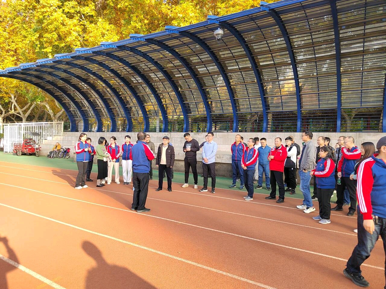 各系老师在到达操场后,以积极饱满的精神状态先分组进行了热身运动。