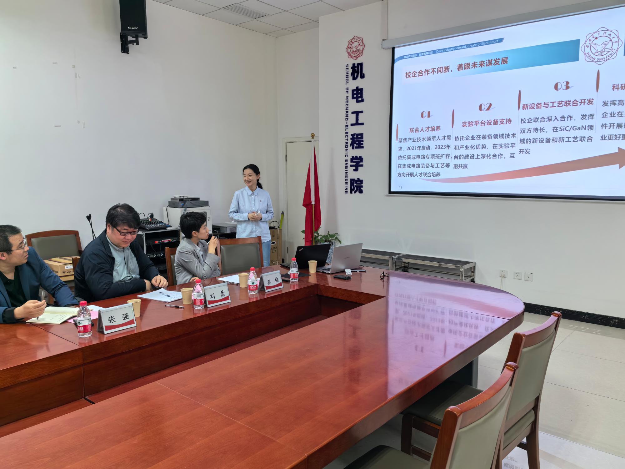 随后,谢谦对学院的热情接待表示感谢,并详细介绍了北方华创的公司概况、与西电的合作历程以及当前校企联合培养的状况。她提到,当前集成电路行业面临人才短缺、培养周期长和内部竞争激烈的挑战,因此希望通过校企合作整合双方资源,推动前沿科技成果的工程转化和研发人才的前置培养,实现学校、企业、教师和学生四方共赢。为此,北方华创已推行“梧桐计划”,初步构建了一套人才培养体系,并邀请对化合物半导体装备有兴趣的学院教师加强技术交流,共同培养更多适应产业发展需求的综合性人才。