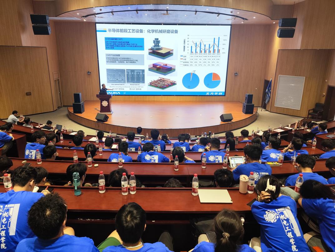 梁玮为“集成电路装备自强班”进行授旗,并对自强班的学生寄予厚望,希望自强班的学生未来能够积极参与到集成电路行业的发展中,为解决国家集成电路产业难题贡献力量。学院大三学生宋国鹏作为自强班学生代表发言,他表示感谢学校、学院和企业给予同学们这样宝贵的学习机会和成长平台,希望和班级同学们一起为实现中国集成电路装备产业的自立自强而努力奋斗。杨盟代表北方华创对学校、学院在自强班的精心筹划和辛勤筹备上表达了由衷的感谢,他表示企业与学院依托自强班开展生产实习、产教融合毕业设计、推荐集成电路专项研究生等合作举措,能够源源不断地培养大批高素质、创新型的集成电路人才,推动技术创新,助力科技产业实现高质量发展。