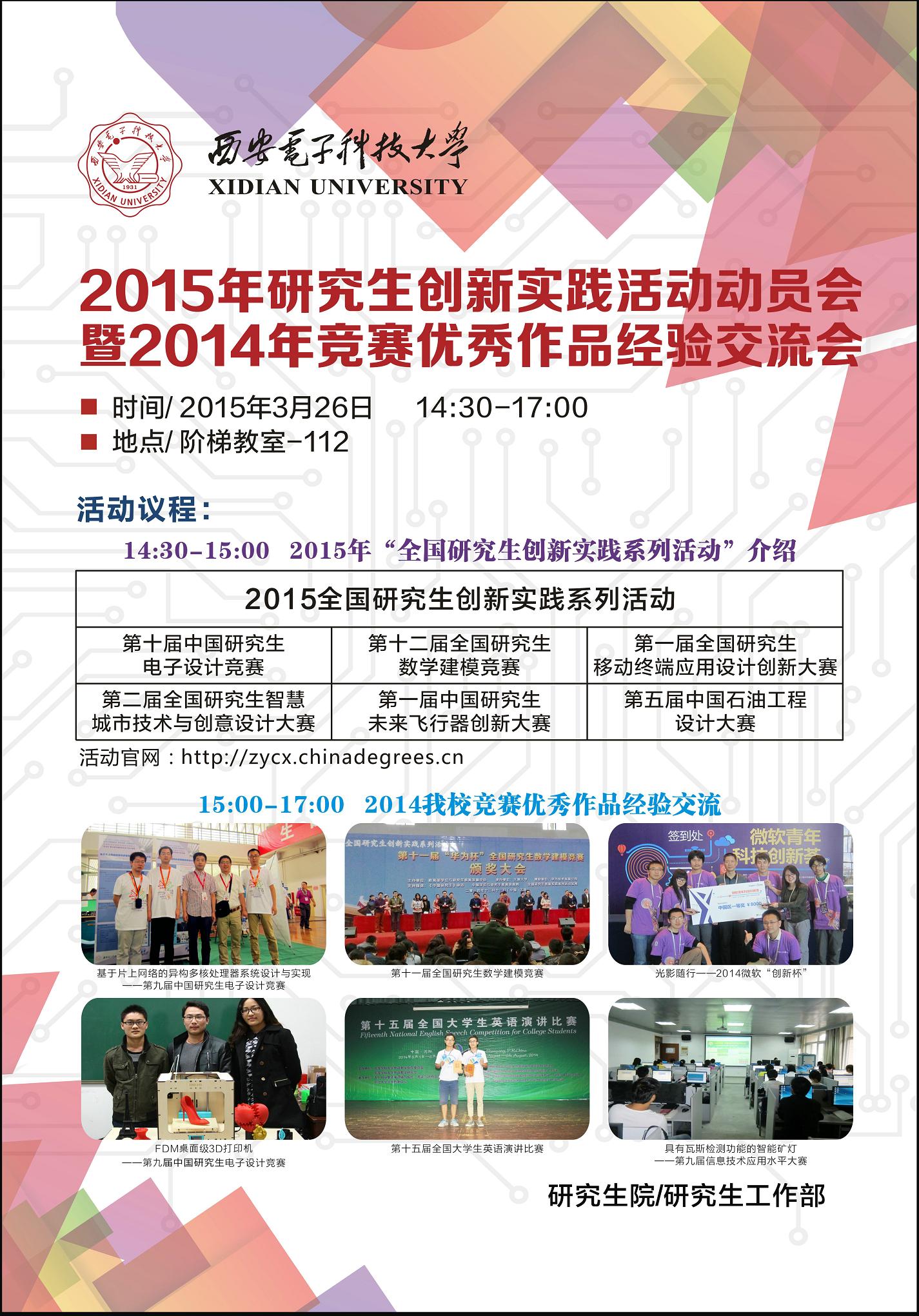 阶梯教室112召开“米兰milan官方网站2015年研究生创新实践活动动员会暨2014年竞赛优秀作品经验交流会”。届时,将向大家介绍2015年研究生创新实践活动六大赛事的具体情况,并由 2014年度竞赛获奖优秀队伍介绍参赛经验。