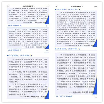 在疫情面前,学院党员利用专业所长,奉献党员力量。学生党员李帅主动帮助街道维修宽带上网问题,并协助联通工作人员共同解决街道网速问题。学生党员高翔与周围热爱健身的同学共同制作运动短视频,指导同学们积极锻炼身体。本04171党支部成员发挥自己专业优势,设计出一幅幅生动形象的抗击疫情宣传画,表达战胜疫情的信心,为武汉加油,为祖国加油。
