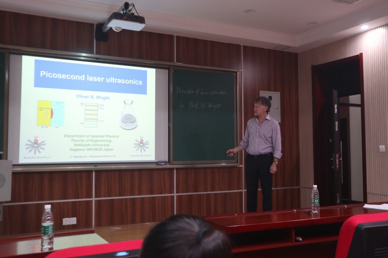 在这个讲座中,Wright教授为我们解释了如何使用超快激光在小尺寸材料中激励比在医院里高1000倍的超高频超声波,实现脉冲回波测量。Wright教授结合医用超声的直观案例,由浅入深,形象、有条理地讲解了超快激光超声的原理与应用场景,讨论了各类应用场景,体现了其扎实的学术功底和创新性思维,使在座的老师和同学受益匪浅。