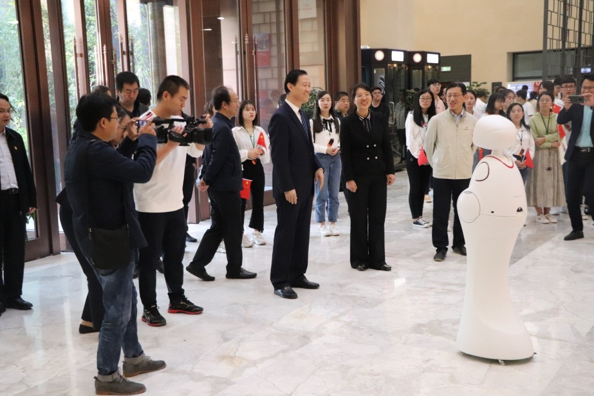 下午4点半,学习小分队与段宝岩院士一行在延安学习书院汇合。延安学习书院是全国首家宣传习近平新时代中国特色社会主义思想的实体平台,是学习新思想的高地,是宣传学习理念,展示用延安精神建设新延安的新窗口。机电院协同校友企业上海思依暄机器人公司为学习书院捐赠了两台智能机器人“西电•小暄”和“西电•小思”(意为宣传新思想),从而架起机电院与学习书院合作共建的桥梁。