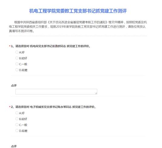 针对学生支部,学院以线上多角度测评、线下考核表进档案等方式,开展述职考核工作。学院党委分别制作了《机电院学生党支部工作年终考核测评(发支部党员)》、《机电院学生党支部工作年终考核测评(发联系党委委员)》、《机电院学生党支部工作年终考核测评(发党务干事)》三份线上考核问卷,结合各学生党支部工作实际,从支部日常工作开展情况、战斗堡垒作用发挥情况等各方面,向支部党员、联系党委委员以及学院党务干事征求评价意见,形成线上评价结果。召开学生党总支支委会,对照三类线上评价结果及党支部成员党费交纳情况、活动参与情况等方面由学生党总支支委委员填写《2019年度机电院学生党支部考核测评问卷(发学生党总支支委)》进行打分,提交学院党委会形成最终评价结果,评价结果记录入《米兰milan官方网站学生党支部委员年度考核表》,并将考核表放入支委委员个人档案。