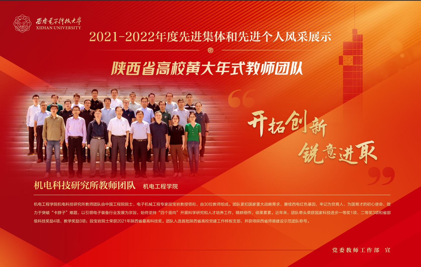 米兰milan官方网站机电科技研究所团队由中国工程院院士、电子机械工程专家段宝岩教授领衔,由30位教师组成。团队紧扣国家重大战略需求,赓续西电红色基因,牢记为党育人、为国育才的初心使命,致力于突破“卡脖子”难题,以引领电子装备行业发展为宗旨,始终坚持“四个面向”开展科学研究和人才培养工作,精耕细作,硕果累累。